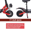Engineered with a high tensile yet lightweight steel frame, our electric scooter handles rough terrain with ease. The 11-inch oversized, knobby tyres ensure a smooth ride, while the front and rear disc brakes offer confident stopping power. Adjustable shocks let you customise the scooter’s handling to your preference, while the anti-slip, extra-wide deck provides added stability.